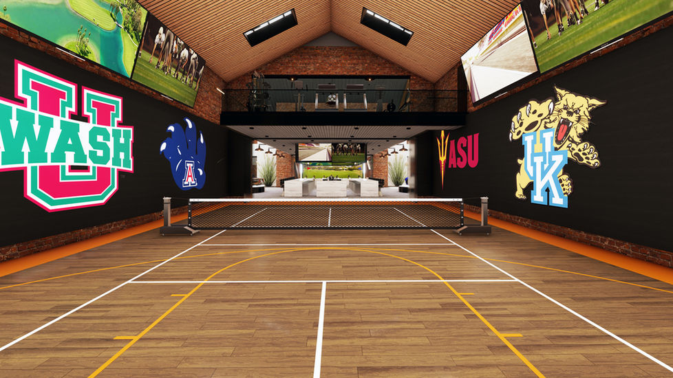 materials to provide a backdrop for an expansive central bar, indoor pool, living room, gym, and immersive golf simulator.